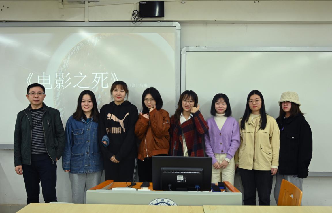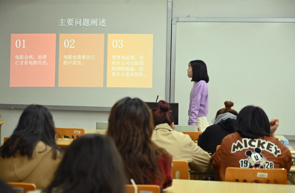 陈露同学首先分享了自己关于《电影的本性》,通过对比《金陵十三钗》小说和电影来佐证书中的观点。任思圆同学分享了《电影之死》对:电影会死,而消亡才会有电影历史;电影也需要自己的卢浮宫;更替是必然,没有什么可以阻碍时间的流逝,没有什么是永恒性。三个主要问题进行了自己的阐述