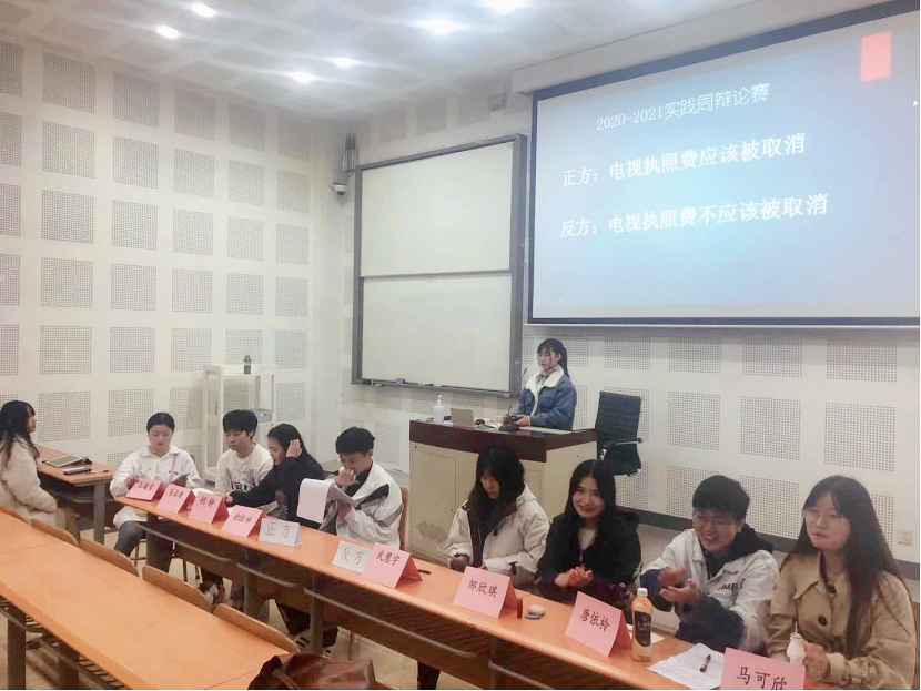 11月4日,由hy3380cc海洋之神主办的校级实践周辩论赛于教学楼B2-1举行。双方辩手经过最初班级淘汰赛的层层筛选,最终由来自2018级广播电视学7班的徐佐帅、胡静、肖正绪、张凝雪组成正方,来自2019级广播电视编导6班的武慧宇、邹欣琪、唐依柃、马可欣组成反方代表各自班级参加此次辩论赛决赛。双方就“是否应该取消电视执照费”展开了激烈辩论。