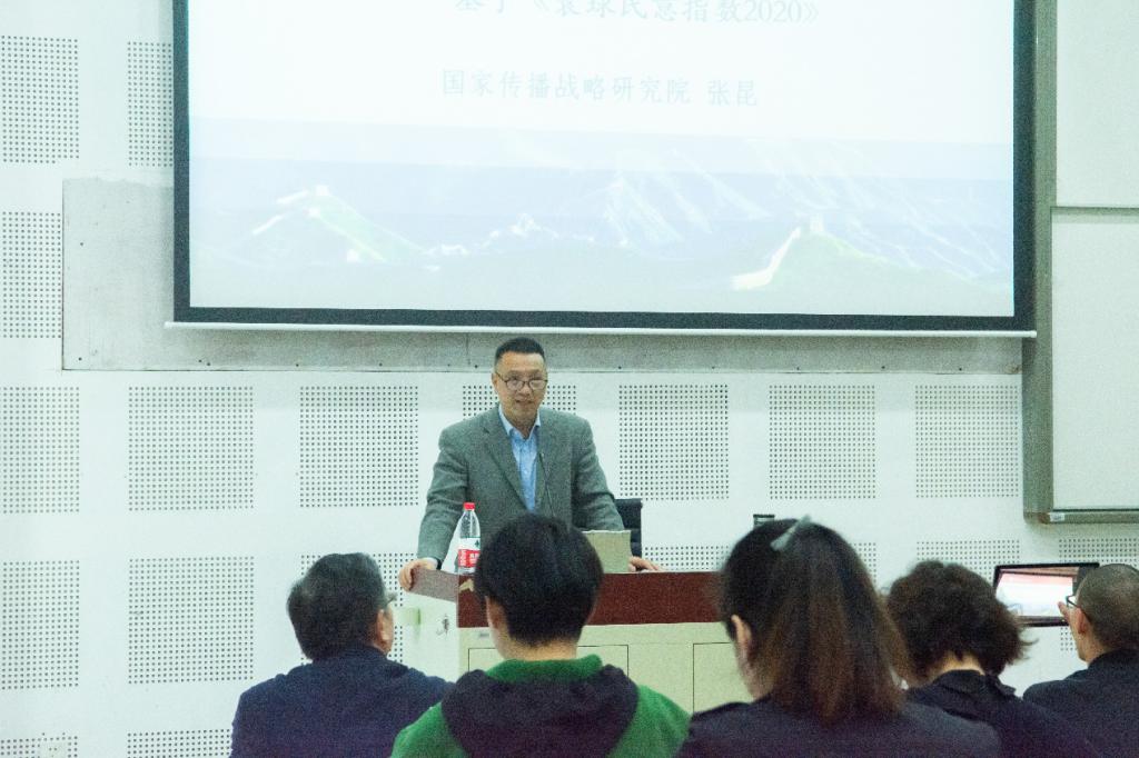 张昆教授从民意指数的研究背景入手,介绍了在百年未有之大变局下华中科技大学国家传播战略研究院对“中国国家形象的他者认知和自我认知”的调查成果。其中,调查结果分为三部分。第一部分为中国国家形象的他者认知。张昆教授展示了13个国家的公众对中国的总体印象、兴趣指数以及各国公众收看中美两国影视节目的频率等一系列调查数据。调查结果显示,各国公众对中国影视节目的收看频率远低于其对美国影视节目的收看频率。对此,张昆教授谈到,中国文化产品在同美国同类产品竞争时往往处于劣势,这值得新闻传播专业学子们关注和反思。第二部分为中国国家形象的自我认知。张昆教授分析了中国公众的大国观念、国际事务观及国家认同观等多项调查结果。其中,他提到,中国受访者对本国媒体的信任度极高,“做中国的传媒工作者是极其幸运的”。第三部分为张昆教授对新闻传播专业学子们的建议。他指出,外国语大学的新闻传播专业员工在对外传播过程中具备外语优势,因此也承担着传播国家形象的重要责任。