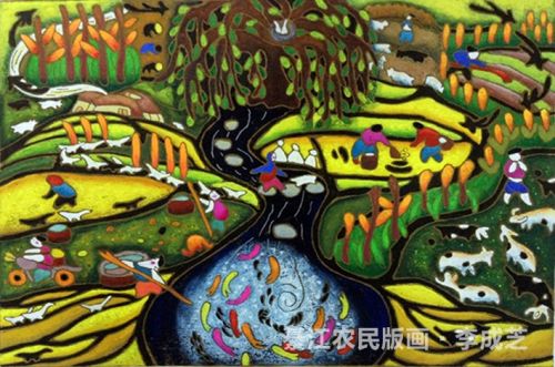 綦江农民版画源于明清年间的木板年画,是一种用刀子先在木板上雕刻出图画,再采用人工拓印而成的纯手工之作,作品构图明快,色彩艳丽,大都取材于广大农民群众的生产生活实践,具有浓郁的民族民间风情和生活气息,是巴渝传统民间艺术的特色代表。它将石刻、木雕、泥塑、剪纸、挑花刺绣、蜡染等古老的民间工艺融入版画之中,使版画艺术充满了生动、活泼、亮丽、质朴、稚拙、幽默等特点;并将蓝印花布、扎染、蜡染、木雕、木板年画、石刻、剪纸、挑花、刺绣等传统民间艺术形式兼收并蓄,更显底蕴深厚。