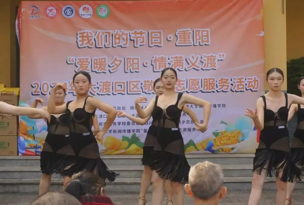 重庆商务学校的志愿者们以热烈奔放、充满韵律感的拉丁舞,瞬间点燃全场气氛,赢得掌声喝彩。川外朝夕志愿协会志愿者们朗诵的诗歌《中国红》,铿锵有力、声情并茂、令人动容。为了强化老人们的参与感,老员工们还来到老人身边,一字一句地教他们读起诗来。