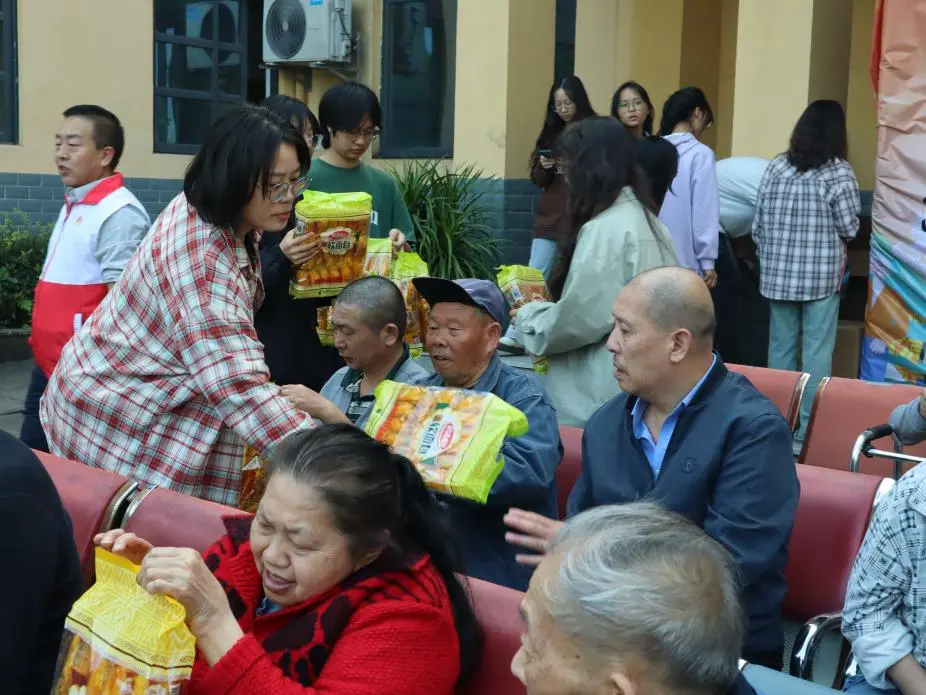 活动接近尾声时,志愿者们为老人们送上了梅明社会服务中心准备的慰问品,并以“合家欢”定格下温情陪伴的瞬间。