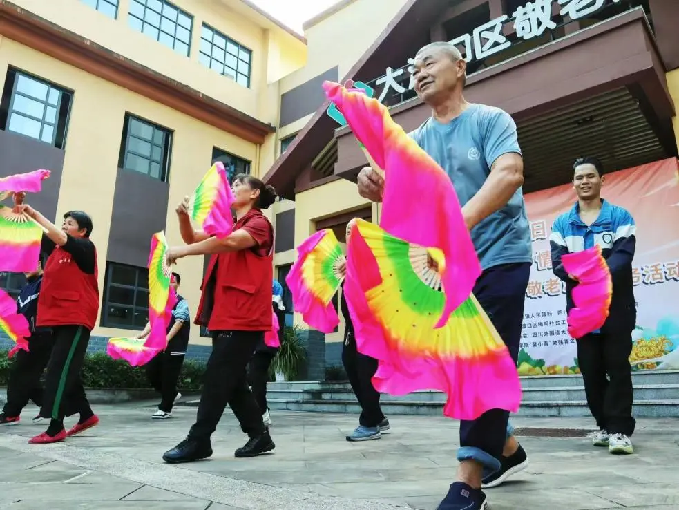 现场氛围逐渐迎来高潮,老人和志愿者们玩起了“翻转舞台”。年已古稀的李同元身体非常健朗,只见他冲上舞台,拿起红扇翩翩起舞,引得在场老人和志愿者们连连称赞。经理罗晓容告诉记者,敬老院每周会举行两次歌舞活动,在这方小小的天地里,这是他们表达喜悦的最好方式。