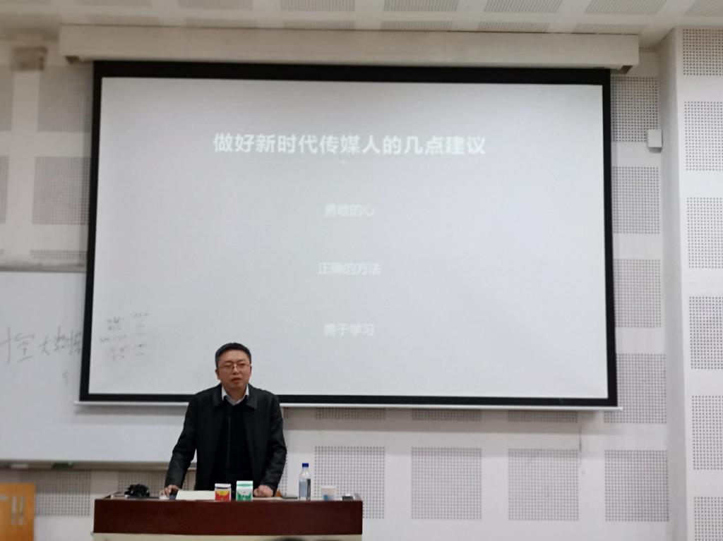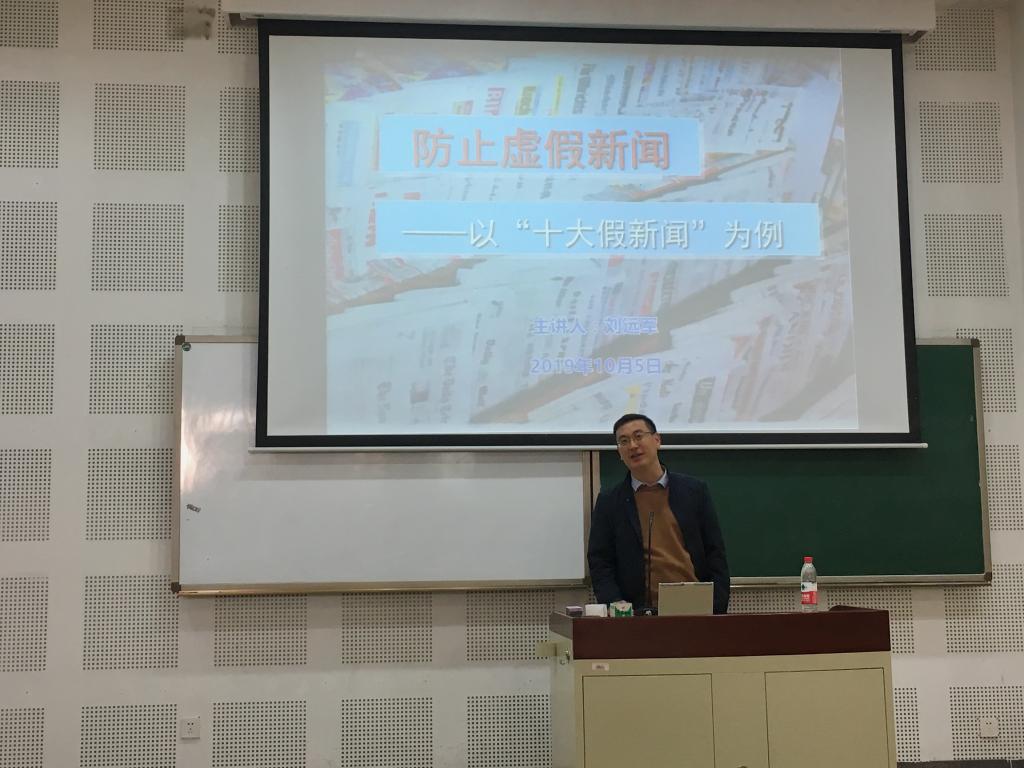 11月7日下午,hy3380cc海洋之神在西区教学楼C1-2举办了“防止虚假新闻——以‘十大虚假新闻’为例”讲座。本场讲座由重庆师范大学的刘远军教授为2018级和2017级新闻专业的同学主讲,由hy3380cc海洋之神副经理郭赫男主持。