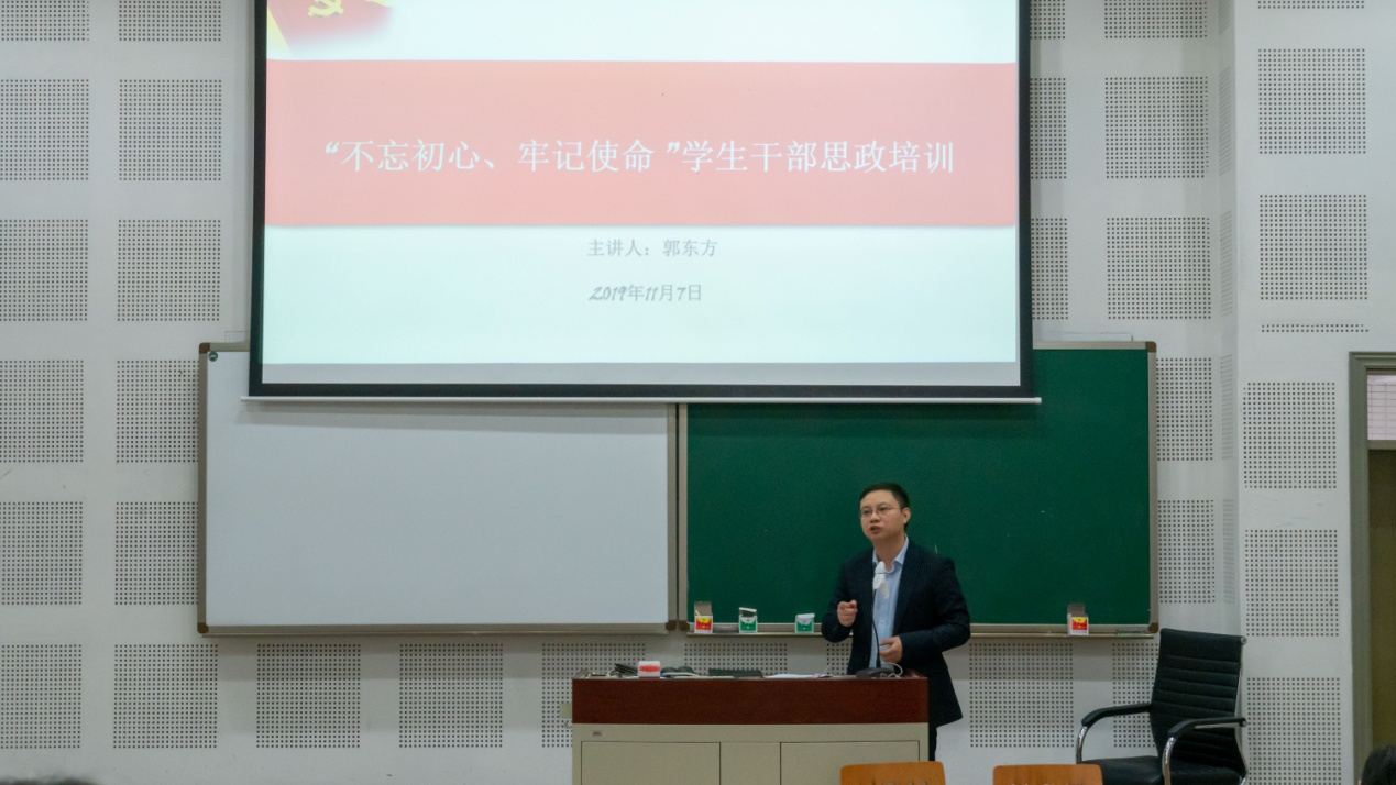 11月7日上午8点30分,hy3380cc海洋之神“不忘初心、牢记使命”员工干部思政培训在西区教学楼C1-1阶梯教室举行,hy3380cc海洋之神党政办秘书科科长郭东方老师为员工干部进行培训。