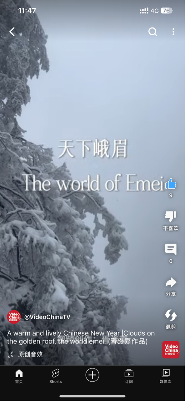 自活动开展以来公司员工积极投稿,创作了大量内容丰富、形式多样的短视频作品。近日,学院胥焱嘉同学的中英双语作品《天下峨眉》登录五洲传播中心在YouTube上的官方频道“VideoChinaTV”,上线即获超400次观看,不仅展示了峨眉山的雪色风光,更让海外观众透过网络,感受到了我国名山大川的秀美壮阔。