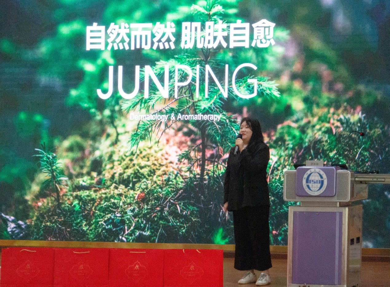 JUNPING市场部品牌经理柳彦女士从JUNPING的源起对品牌进行了简单介绍,分析了产品的核心理念“自然而然,肌肤自愈”,解释了产品的“成分天然、科学有效、芳香治愈”三个特点。“JUNPING的品牌使命就是,‘为每一个人带来健康的美’。”柳彦女士向大家讲解道,同时也向大家传递了“成功的作品是由对品牌的了解和自身足够的创意结合而成的”的概念。
