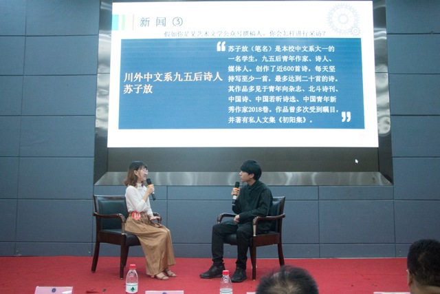 在最后“新闻当事人采访”环节中,潘紫菱以某艺术文学公众号的身份采访公司中文系九五后诗人苏子放。她将嘉宾的笔名“子放”为切入点展开对话。新颖的切入点、高质量的问题、稳健的台风,受到评委老师的一致肯定。