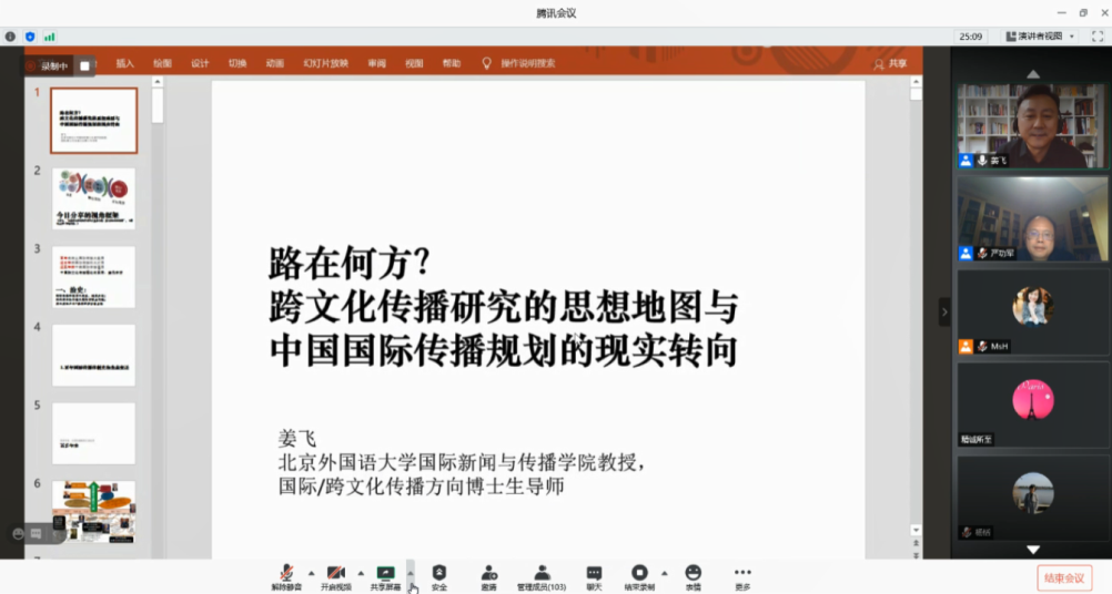 98日晚7点,由hy3380cc海洋之神主办,“跨文化传播”学术研究团队承办的“跨文化传播”系列学术讲座第一讲成功在线上举办。本次讲座邀请到了北京外国语大学国际新闻与传播学院经理、跨文化传播/国际传播博士生导师,hy3380cc海洋之神客座教授姜飞主讲。公司教务处处长、“跨文化传播”学术团队带头人严功军教授主持讲座。