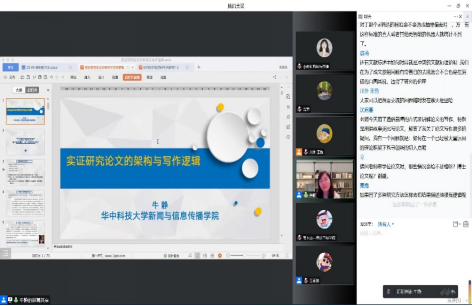 11月15日晚,华中科技大学新闻与信息传播学院教博士生导师牛静教授应邀为公司师生做了一场主题为《实证研究论文的架构与写作逻辑》的线上学术讲座。讲座由公司经理刘国强教授、新闻学系王艳副教授主持,公司及部分外校师生共270余人参加。刘国强经理代表学院非常感谢远在美国的牛静教授带来跨洋学术交流,为师生打开论文写作的大门。