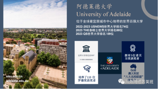 阿德莱德大学(University of Adelaide),创立于1874年,坐落于澳大利亚南澳州首府阿德莱德,是一所综合性高等学府。该校是澳大利亚八校联盟成员,共培养出5位诺贝尔奖得主和110个罗德奖学者,亦是全澳高校中“自培”诺奖得主最多的大学。根据2022-2023 USNEWS世界大学排名,阿德莱德大学高居第74位(信息来源:USNEWS官网)。根据2023 THE泰晤士世界大学排名,阿德莱德大学高居第88位(信息来源:THE泰晤士官网)。