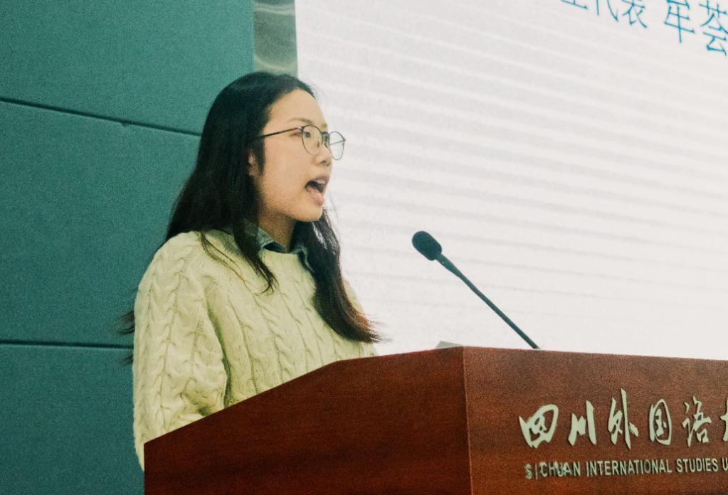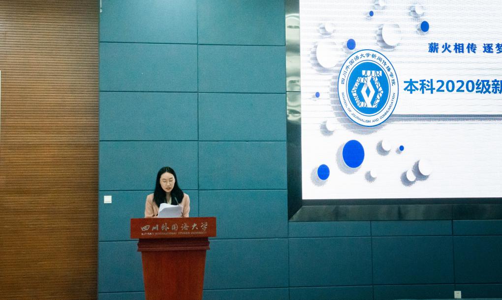 2020级4班的徐佳佳作为新生代表上台发言。她分享未来四年对自己的规划和期望:制定学习计划,充实老员工活;树立规则意识,提升自控能力;常怀感恩之心,争做有用之人。最后,她祝愿大家在川外新传度过丰富的四年生活,踏实走好脚下的路。以不懈奋斗擦亮青春底色、叩响未来之门。