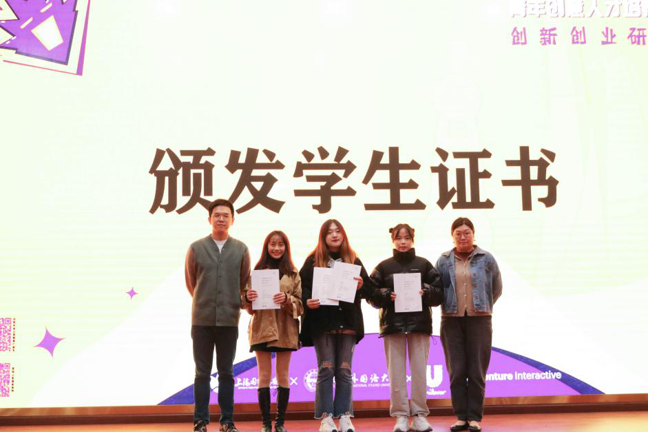 当日下午4点15分,创新创业研习坊在公司培英楼放映厅举行颁发员工证书仪式。上海国际广告节执委会秘书长季华敏、埃森哲互动数字营销总监兼体验构架师周骏、联合利华数字营销对外品牌孵化器事业部总监王雪孺及策略顾问杨红燕出席,王雪孺、周骏为每组选手颁发创新创业员工证书。