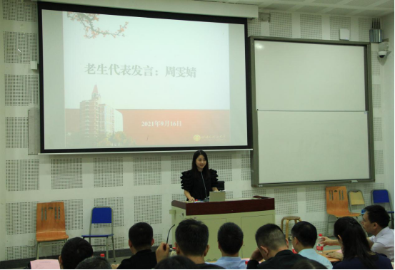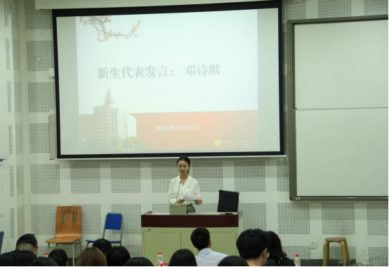 2021级新闻与传播专业研究生代表邓诗琪在发言中细数来时不易,同时以坦诚的话说出对未来的期许,鼓励自己和同学们未来继续努力。2020级新闻与传播专业研究生代表周雯婧在发言中欢迎研一新生选择了川外,劝告同学们拒绝躺平,享受生活,感受生活之美。
