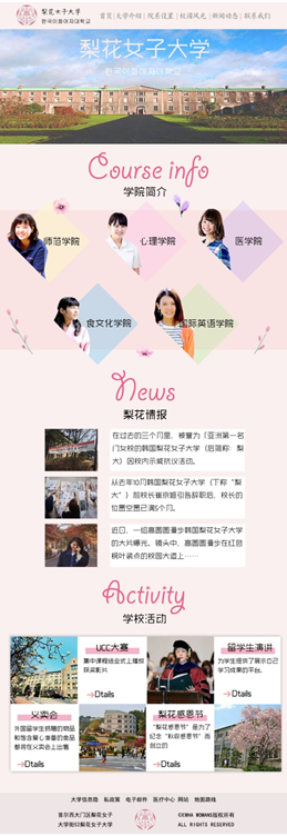 网站介绍:面向中国旅游观光客、有留学意向的员工及家长,为韩国梨花女子大学定制中文网站。
